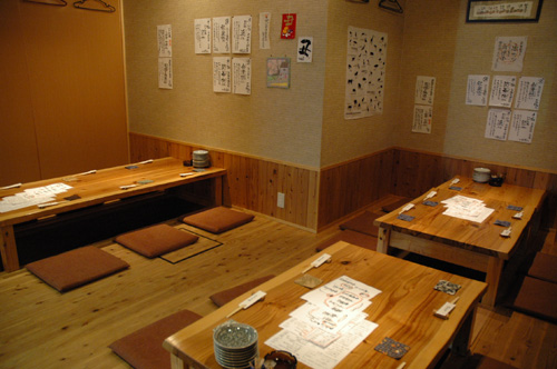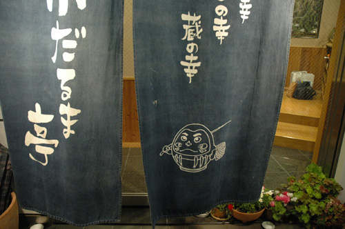 小だるま亭は人通りの多い交差点の角にあります。 2階に目をやると、おおきな一枚板の看板があるので、それを目印に階段を上がって来て下さい。 紺のれんをくぐれば、元気なスタッフがお迎え致します。小だるま亭は、入口で靴を脱ぐスタイル、ゆっくりとお酒を飲みながらくつろいでいって下さい。